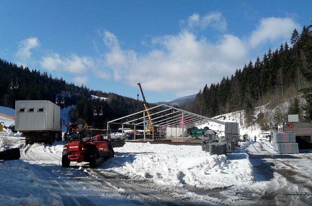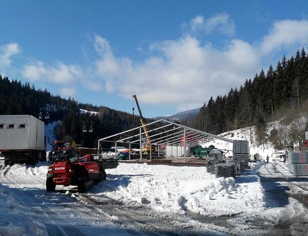 Wind, Schnee, Regen, Stände, Zelte, Geräte und Arbeitswolken